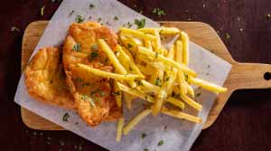 4 x Medium Hake Fillets, 4 x Footlong Cheese Russians, 2 x Large Chips, Savoury Rice or Salad